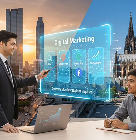 SEO, Google Ads, Meta Ads, and campaigns to generate monthly student inquiries.